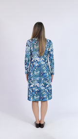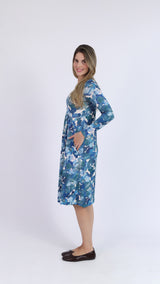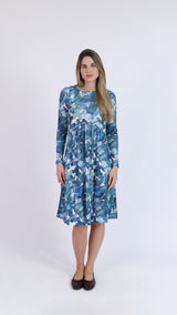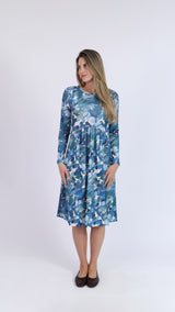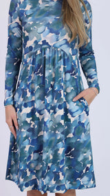 שמלה מבד נעים וקליל עם כיווץ מעוגל מתחת לחזה וכיסים מוסתרים בצדדים